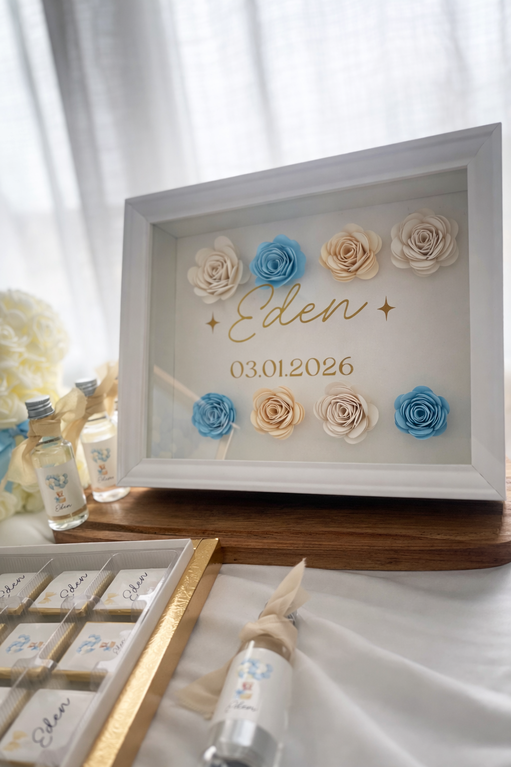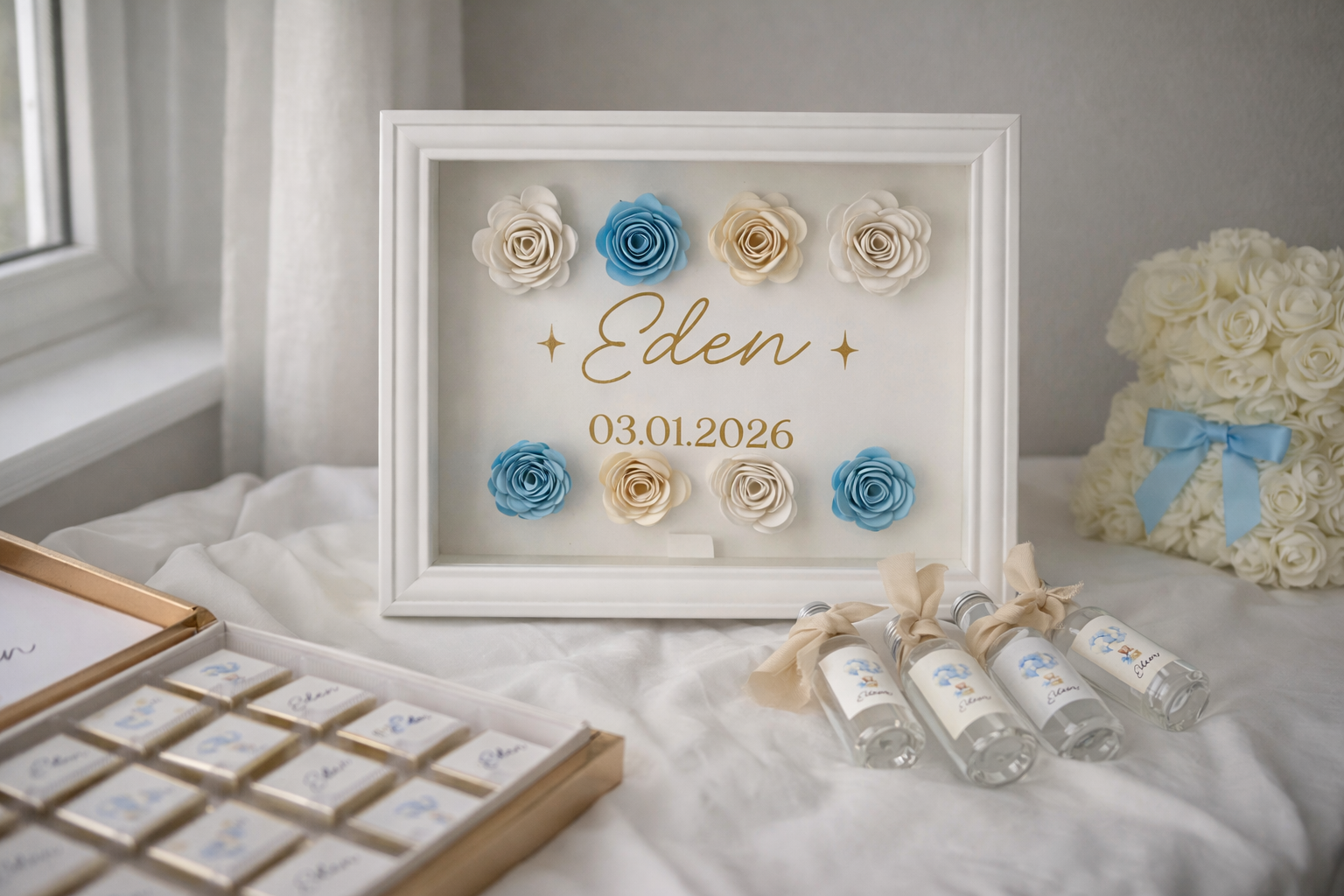 Son design épuré est sublimé par des fleurs en relief aux teintes harmonieuses, disposées avec soin autour du prénom et de la date de naissance.