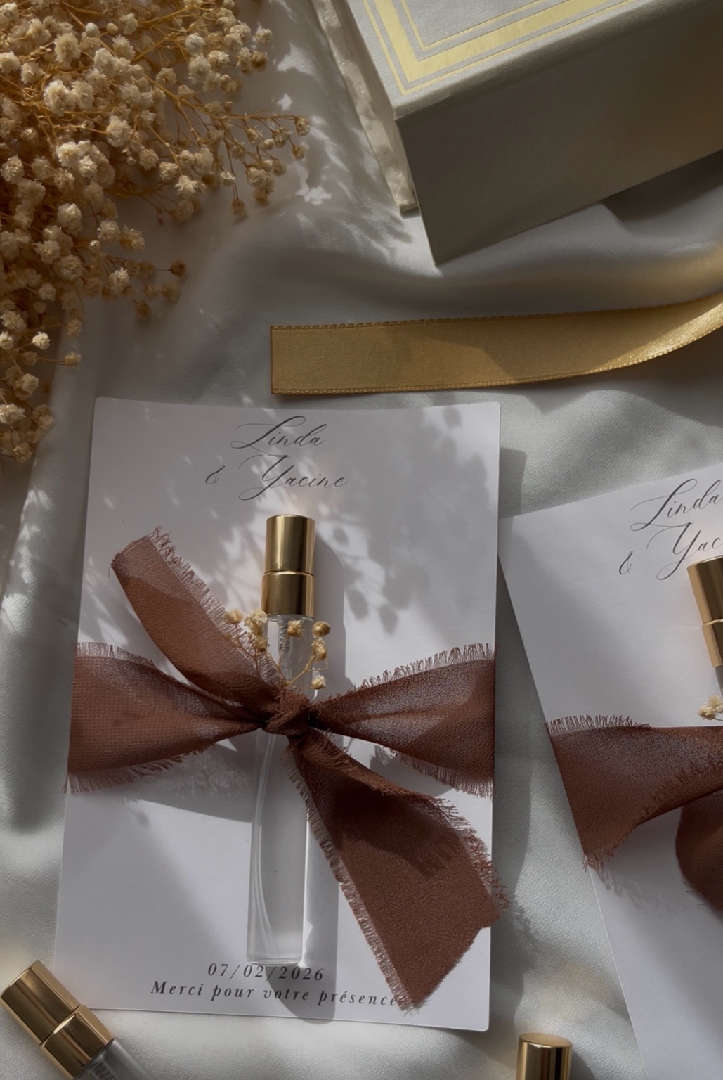 Cette fiole parfum 10 ml est présentée sur une carte personnalisée avec les prénoms et la date de votre événement.